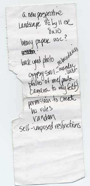 I am using this journal to extend my creative process. To let go. I don’t want to set any self-imposed boundaries. I really want to explore all the options and record my thoughts as they happen. I think this will be a very rewarding experience. Maybe I can be a little less anal retentive and a little more free.