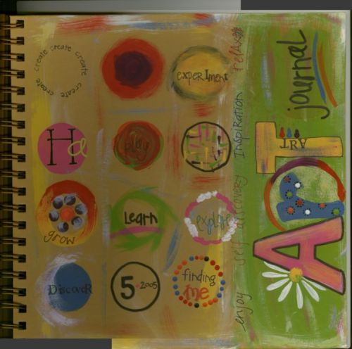 I have such trouble scanning my work! Finally got my cover finished. I wanted to do something different from my usual scrapbooking, so I refrained from using my patterned paper. This was just me and my paints and it felt great! Since my cover is so awfully scanned, there are just random words: create, grow, discover, play, experiment, learn, finding me, explore, enjoy, self discovery, inspiration, relax. I can’t wait to start my first entry!