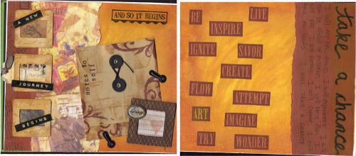 Here are my first pages. It’s been over 6 months since I’ve done any altered books or collage work, so I feel a little rusty. Hopefully my future pages will be better! LOL! I did enjoy working on these pages though. It felt really good to play and have fun with it. For me this “new beginning” and me starting this art journal is about me wanting to take chances in life and with my creativity. I’m one of those people that always has to plan everything. I’m also hesitant sometimes when it comes to trying new things. Doing an art journal is something new for me. I want to be more free and more willing to try new things and take more chances.