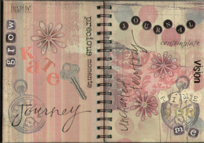 I opened the book out and scanned both front and back covers together, so in the pic the left hand side is the back, and the right hand side the front. Covering the blessed thing took ages, trying to cut all those square holes for the spiral to go through in the patterned paper! The pocket watch is one of my stamp designs stamped with Peacock Gold ink (the edges of the book are inked with this too). The flowers and the key are stickers, and the words are a mix of stickers and rub-ons. Surprisingly enough (for me) it all came together really easily … no agonising over what to put on. I was speaking to someone who was demoing at a show a few weeks ago, she had piles of fabulous tags and things that she’d made. She told me that her secret is that she just doesn’t care – she just goes with the flow and sees what happens – this is my new resolution!