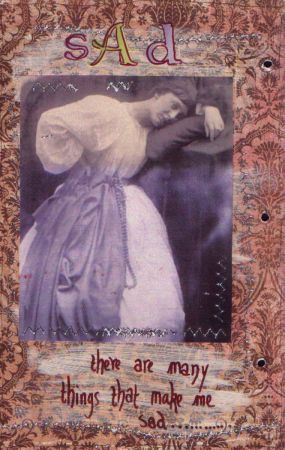 This page makes use of an internet image of a Julia Margaret Cameron photo. She was a pioneer Victorian female photographer, adn her work is very pre-Raphaelite in style. Since I like my journalling to be private, it is on a small tag filed adjacent to the mood page.