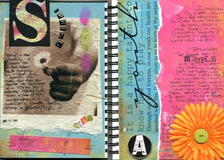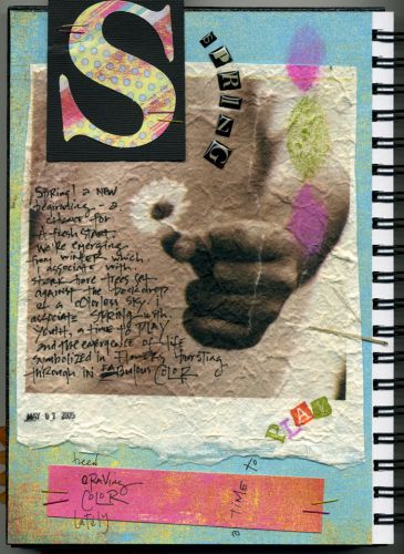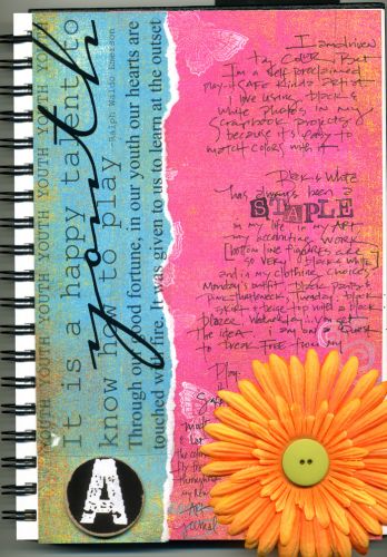 “Spring. a new beginning a chance for a fresh start. We’re emerging from winter which I associate with stark bare trees set against the backdrop of a colorless sky. I associate spring with youth, a time to PLAY and the emergence of life symbolized by flowers bursting through in fabulous cOlor. I am driven by color. But I’m a play-it-safe kinda artist. I love using black and white photos in my scrapbook projects because it’s easy to match colors with it. Black and white has always been a staple in my life. In my art, my accounting work (bottom line figures are so very black and white) and in my clothing choices. Monday’s outfit: black pants and pink turtleneck; TueSday:black skirt,beige top with a black blazer; Wednesday: ….. well, you get the idea… I am on a quest to break free from my pLay-it-sAfe MODE and let the colors fly free throughout my new aRt jOurnal…”