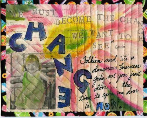 Well, here is my entry for the week. I am working with fabric, paint, my computer and just stuff I have around here. I also have a bit of a challenge with showing my work. I am really working on this and with some hand holding with other like-minded people I will conquer this! Change….BRING. IT. ON.