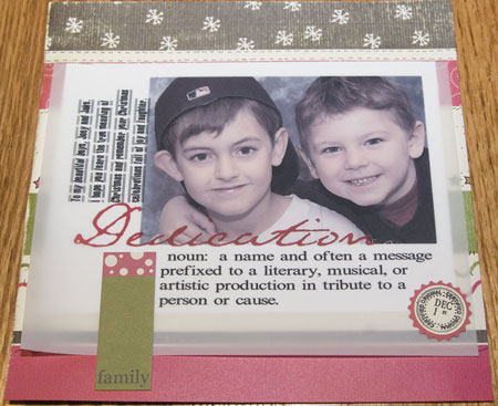 I had fun doing my first page. I made the boys pose for a picture before school then I design my text and photo. I printed a color photo on White Magic Vinyl paper then printed the journalling and a black/white photo with lowered opacity on Sheer Heaven paper. I used stamps by Technique Tuesday and Making Memories. Sweetwater Express paper and journalling tab.