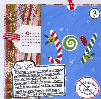 My page is pretty simple. The background is paper from Rusty Pickle. I also used some stamps from Stampin’ Up (calendar), Autumn Leaves (journaling stamp) and PSX (Santa Postmark). I also included one of the cards we’re sending out. It doesn’t open like a traditional card, it has a tag that pulls out the top and the tag can still come out on the page also.