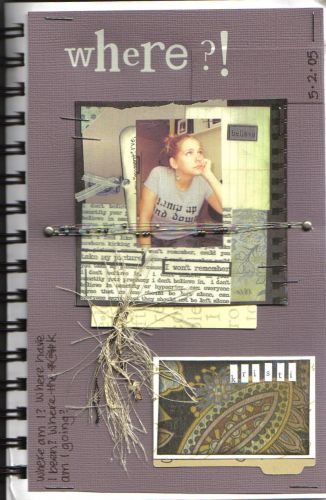 There are 2 bits of journaling. The first says “The new beginning. My first online, shared art journal. Very raw and personal, just my style!! So far I dig this group and hope to learn new things from these new minds. Thank you Shimelle for this opportunity to grow as an artsy gal. May 2, 2005”