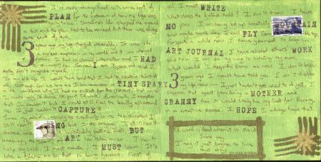 I am into clarting with ink and paint. I am using loose watercolour paper folded in half that I will sew into a book at the end. The top layer of green paint and the dark green have interference gold mixed in. Makes it kind of shiny and glittery. Used some stamps, rubber and postage.