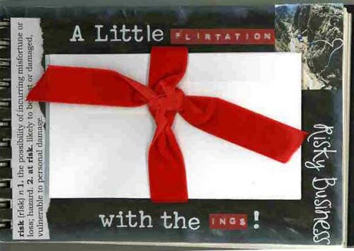 Much ‘risk’ going on here! First off, I don’t ‘do’ black white and red at all and definitely not together – already done one red/black page and so here I am at it again but this time with the added risk of the white! Made myself abandon my stamps and opted for rubons and dymo tape instead. Background is just black acrylic with white chalk ink on the edges…looks a bit like a blackboard I think. The little pic in the corner, in case he doesn’t show up very well, is a man bungee jumping. The white envelopes in the middle are Monday’s project from the mail art class, an accordion book of envelopes – seen here without my journalling on..it is very, very long – there are eight envelopes and I have managed to completely cover the back of them with words and my writing is not big! Inside the envelopes are little cards with an exploration of each ING from page one of my journal…quite a risky thing to be doing.