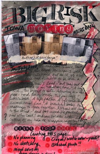 Argh…I feel like a technological idiot! How frustrating. Anyway…here’s (maybe?) my “risk” pages. Totally out of my style…I’m usually linear, organized, planned, and minimalist. These have lots of watercolor, ink, acrylic paint, rub-ons, no planning. Text is about deciding to move from IA to MI to test the waters with my then-boyfriend, now husband.
