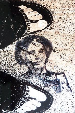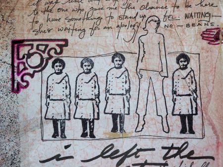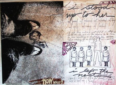 just trying to upload this real quick….hope i remember how to do it! page about my recent risk…. tissue paper adhered with gel medium, watercolor wash over it, photo on transparency overlay, stamped images.
