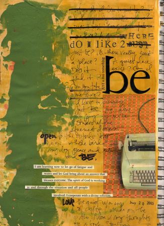 Layers in there include yellow-mustard paint, more of that Texture Magic dimensional paint from Delta (using a spatula-thing from Delta as well), handwriting, stamping, and some words from a daily devotional booklet that I cut out and adhered/sealed with Golden matte medium. The “be” letters are metal from American Crafts. Liked the lines created by crossing out the first few lines – mimiced the lines of text on the bottom. Random typewriter image was from a stock photo mailer.