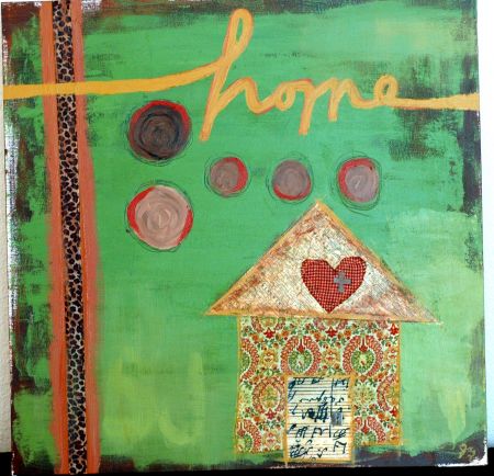 I got the idea from this weeks spark, so I decided to share. This is a mixed media collage on canvas, that I made for our family. It will be given to my husband at his birthday party, but it wasn’t REALLY painted for him. The paints are acrylics, there is PP, fabric decopaged on, sewn fabric decopaged on, a lot of paint, ribbon, etc.