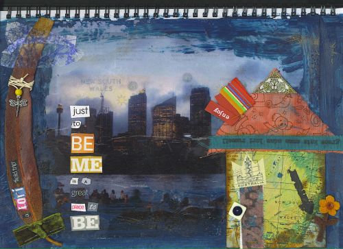 I loved the houses and the artist Shimelle suggested we check out – I decided to give it a go and used a map of NSW for my house – fabric for the roof and ribbons – I wanted to use as a backdrop a picture of the Sydney skyline – I printed the photo on regular paper – glued it to the weather page of the newspaper and clear embossed a few times until the newspaper could be seen coming through in the sky – I then bent the picture to get a crackling effect – painted around the outside and put a gumleaf down the left side – it’s held down by a piece of ribbon at the bottom and a piece of tissue paper at the top – the words are a reminder to myself to just be ME!