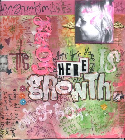 I had an amzing time making this. This is my first entry..I am a bit behind but I am OK with that. I started with white piece of cardstock and then took watercolors and painted it, wiped it with water and did it again until I liked it. I used foam stamps, mailbox stickers, and the ‘goal’ is done with stickers with hot pink foamy paint over the top of it..I love the little wings the most and the fact that I didn’t mind swirling paint on my picture…Tonz of handwritten journaling…And my favorite quote ever “Imagination is more important than intelligence” which is from my guy, Einstein.