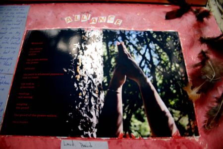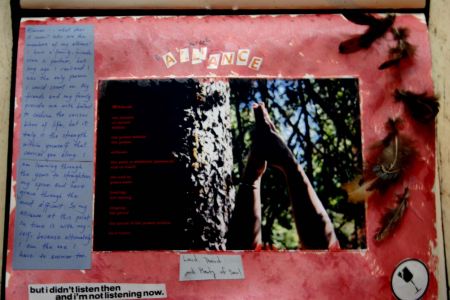 This was a surprisingly hard entry for me. I took the picture earlier in the week, and spent some time working with the photo and the poem, but didn’t finish the piece until yesterday. I’ve been thinking a lot lately (and you may have noticed this theme through a lot of the work I have put up here) about the alliance we build with ourselves. To me it is far easier to build strong alliances and partnerships with friends and lovers than it is to commit to fostering an alliance with myself. So that is what I explored here. The background is pigmented ink, various lettering and images from magazines, and feathers I have collected over the years. The poem is by Gary Snyder.