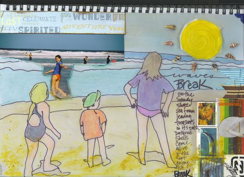 The word BREAK reminded me of holidays – that led to the ocean and trips to the beach – waves breaking – the excitement and fun we have at the beach – so lucky to live so close. I tried the chalk drawing which included 3 of my children and put a “real” photo of the 4th at the top trying to blend it into the drawing – some beach “stuff”, stamps down one side – a sun and shells for the sun’s rays.