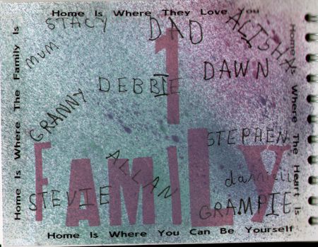 I’m sludging big time so I’ve jumped ahead to do this weeks ( uploaded it in Mum’s name the first time). I sprayed the background with adirondack colour washes and spritzed with water then wrote the names of my family down. I stamped ‘1 family’ with chalk ink and added home slogans in dymo.