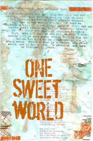 the first thing that popped into my head when i saw the word one was the song by dave matthews band called “one sweet world”. i did a wash with watercolors and walnut ink and then ironed it while it was wet to do the background. then i printed out the words to the song off the internet and pasted them on. then i used my typewriter to also write out the words. then i just added some rub ons for the title and tape as accents. i actually thought it turned out so pretty cool. the reason i also was drawn to this song was because it is about our world. about being ONE as a whole world. about coming together as people. not judging. just accepting.
