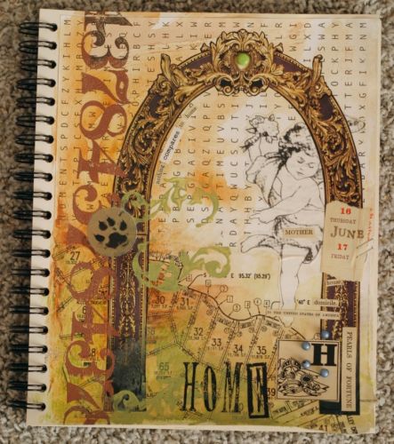 I seem to use b/w drawings on my background. I grabbed some wordsearch paper and a copy of the plat of our subdivision, and a cherub that I had laying around. Did a wash over those papers and repeated our house numbers along the leftside with big stamps, then embossed with copper embossing powders. I had fun cutting up text fom some old books. Added blue beads.