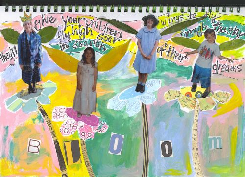 Loved the wings prompt – for this page – I used a mixture of acrylic paints, torn paper for the flowers, leaves from native Australian trees – eucalyptus, wattle – photos of my 4 kids – I wrote: give your children wings to fly – they’ll fly high – soar through the sky in search of their dreams.