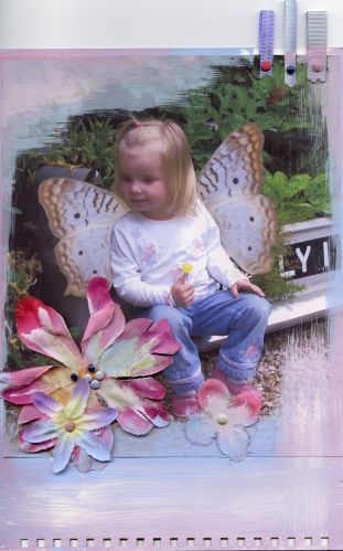 Photo printed on regular cardstock (which my scanner seems to hate) and wings added manually (with glue, not a photo prog.). Butterfly was a photo downloaded from interweb. Paint, blossoms, ribbon….......words? Where has me muse gone!?!?!? She better not be down the pub watching Live8!!! Ooh, the grey bit at the top is overscan, the page finishes with the blue paint so the ribbon sticks out.