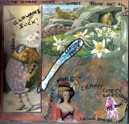 It bugs me that my kids make messes all day long and I have to clean them up. I wish it wasn’t so hard raising kids. I wish i wasn’t so hard on myself. I wish I didn’t expect more from people. I wish more people would be ‘real’. I don’t like fake people who only care about money and status. It bugs me that I’m so tired today. I don’t even feel like doing art. I wish my son didn’t get silly putty in his hair that had to be cut out. The weekends are too short and the weekdays aren’t fun enough. I hate being in a bad mood since it doesn’t happen that often. I hate when the phone rings at the worse times. It’s bugs me when people don’t write back. Things I don’t like: shallow people, cutesy ‘polite’ art sucks, clowns suck, prissy fake people, crappy cutsy stamps suck, crying babies, particularly my own!