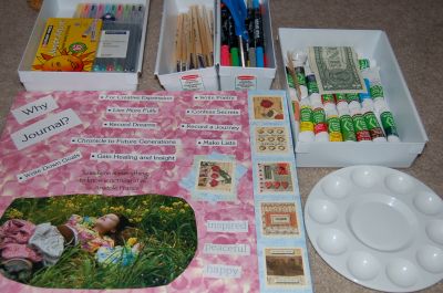Here is a pic of my art supplies. It is pretty basic right now. I am planning to use stuff from around the house like fabric samples, magazines, and whatever else I can fine to incorporate into my art. I also included the back of my art journal in my picture. I was too excited and could not wait to get going.