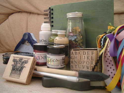 Anyway, here is my pic of my essential items. I’ve painted my journal Secret Garden green, it’s a 7 Gypsies one that was lying around in my cupboard, it has black pages inside and some little inclusions like tags and envelopes which I thought might make for some different types of entry this time. I also have rubber stamps, ink, paint, permanent black pen, craft knife, foam ‘brush’ and my corner rounder oh and blossoms and ribbon which seem to be the main type of embellishment that I use anywhere these days, lol!