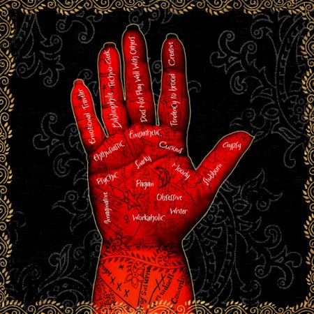 So I had my husband take a picture of my hand, then I scribbled some arcane symbols on various papers and scanned them. I layered copies of the scribbles onto the photo of my hand, and then decided to be more blatant about the whole thing and add words describing myself: “Writer, Workaholic, Snarky, Creative, Loner, Bibliophile, Traveler, Gypsy, Does Not Play Well With Others, Techno-Geek, Pagan, Tendency to Brood, Obsessive, Curious, Creative, Psychic, Empathetic, Stubborn…” that about sums me up. I then subjected the image to various indignities in Photoshop, and added a background and a border from Dover’s Henna Designs book. I may go back into this and add more stuff later as the spirit moves me … or not.