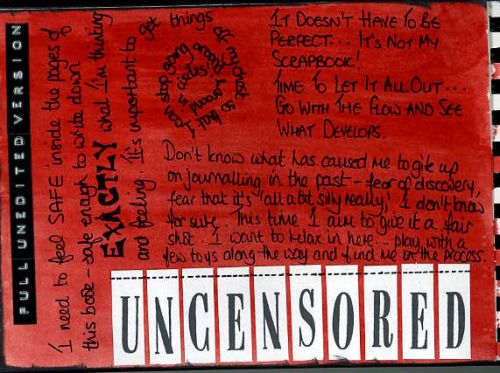 Have managed a page 2 today. Just playing with different things at the moment to see what I like best – first page used all inks, this page uses acrylic paint and ink. Felt like using some different lettering other than my handwriting so went for letter stamps and dymo. Just a few musings on the fact that I want to be able to write what I feel in this book instead of what looks good – the word ‘uncensored’ set me off – I think it was in Cathy’s entry, and I went from there. These first two pages have been more simple than I thought they would turn out – I am trying very hard not to fuss about and ‘perfect’ them too much as although I want the pages to look good, I want to get the words down more at the moment.